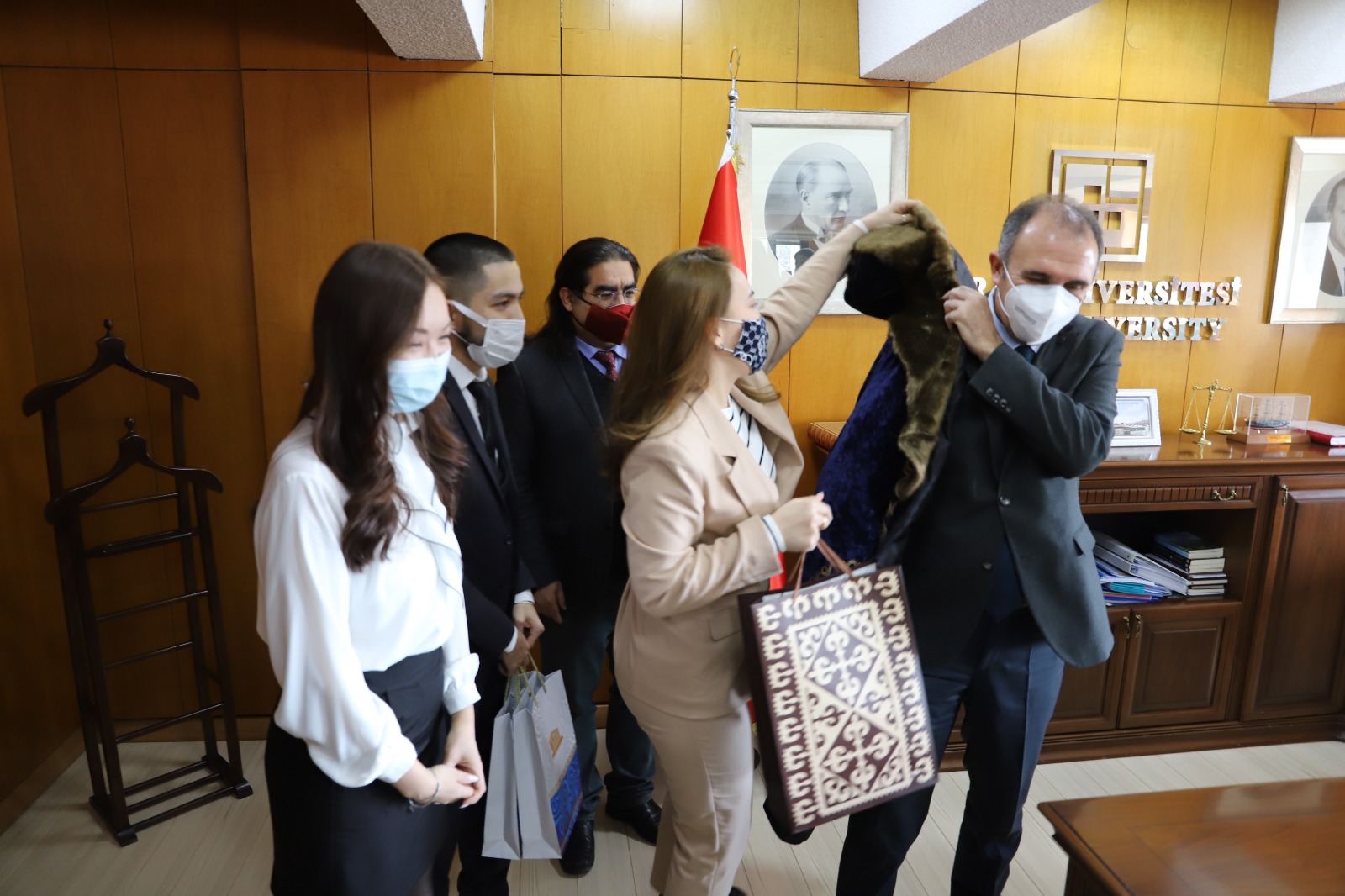 Fırat Üniversitesi Rektörü Prof. Dr. Fahrettin Göktaş, Kazakistan Abay Kazak Milli Pedagoji Üniversitesi’nden staj yapmak için Araştırma Üniversitesi seçilen Fırat Üniversitesi’ne gelen 30 Kazakistanlı öğrenciyle bir araya geldi. Kazakistanlı öğrenciler yöresel kıyafetleri olan Çapan kıyafetini Rektör Prof. Dr. Göktaş’a giydirdiler.