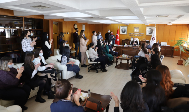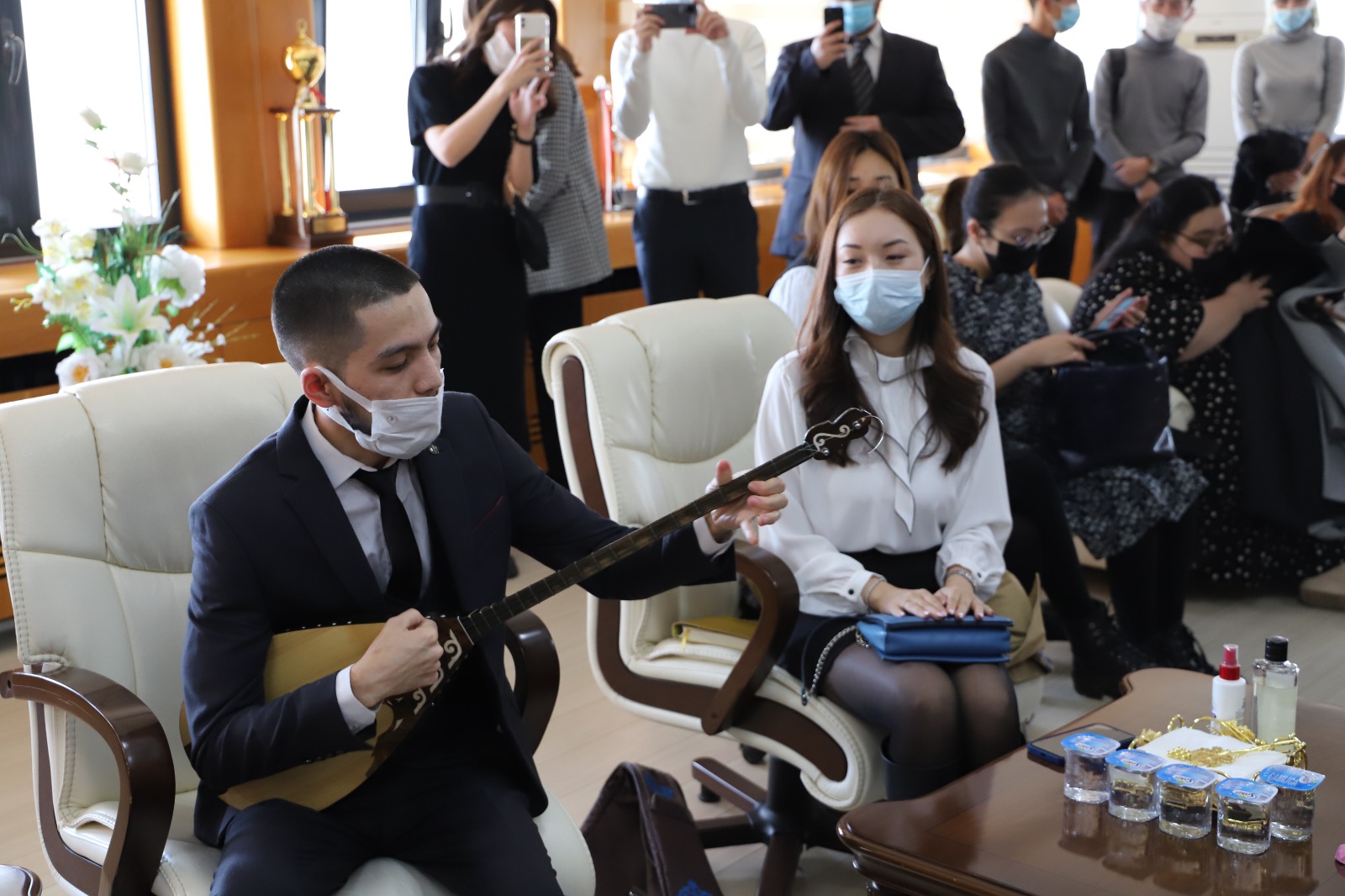 30 Kazakistanlı öğrenciyi Rektör Prof. Dr. Fahrettin Göktaş makamında ağırladı. Kazakistanlı öğrenciler Rektör Prof. Dr. Göktaş’a ziyaretleri sırasında yöresel müzik aletleri olan Dombra ile çeşitli eserler seslendirerek, Kazakistan’a ait Çapan giysisini Rektör Prof. Dr. Göktaş’a giydirdiler.